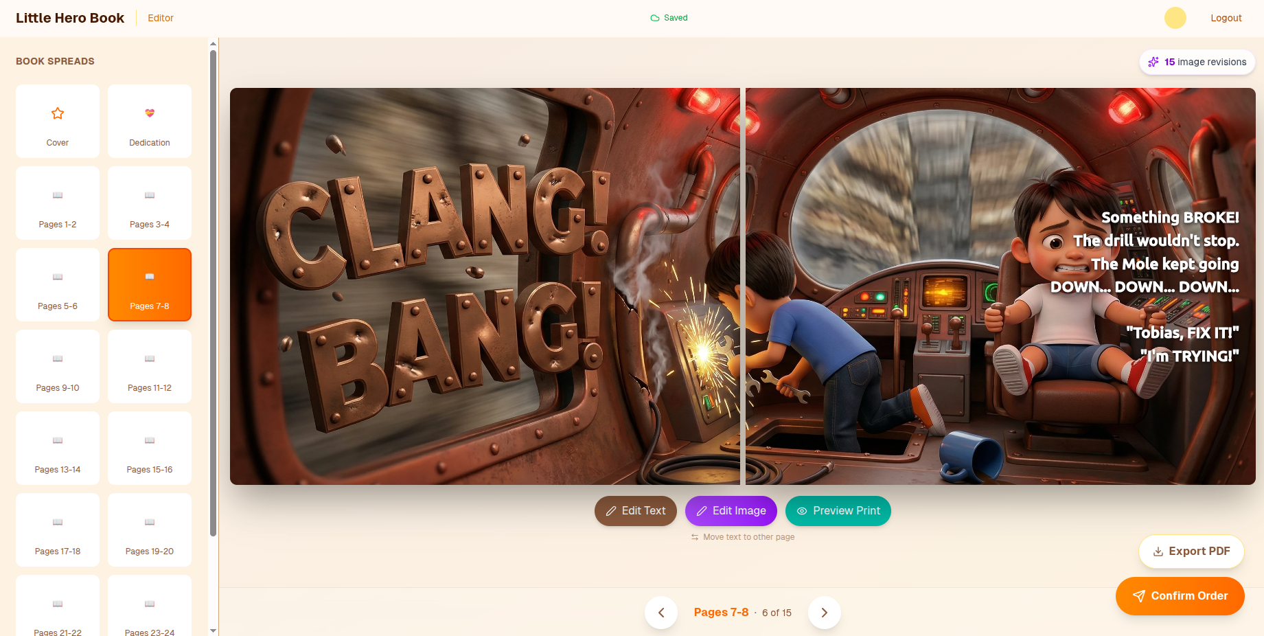 Once your book is generated, you get a full editor to tweak the text, regenerate any illustration, and move content around — until every page is exactly right.